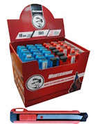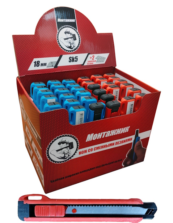 Нож со смен. лезв. обрезиненный, 5 лезвий 18мм с автозаменой., ABS+TPR, стопорн.винт сзади "Монтажник"