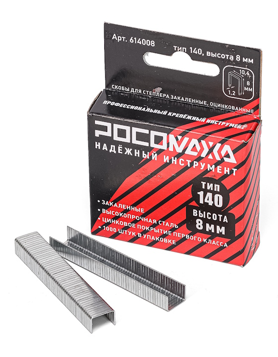 Скобы для степлера закаленные, оцинкованные (тип 140, 1000 шт./уп.), высота 8 мм "РОСОМАХА"