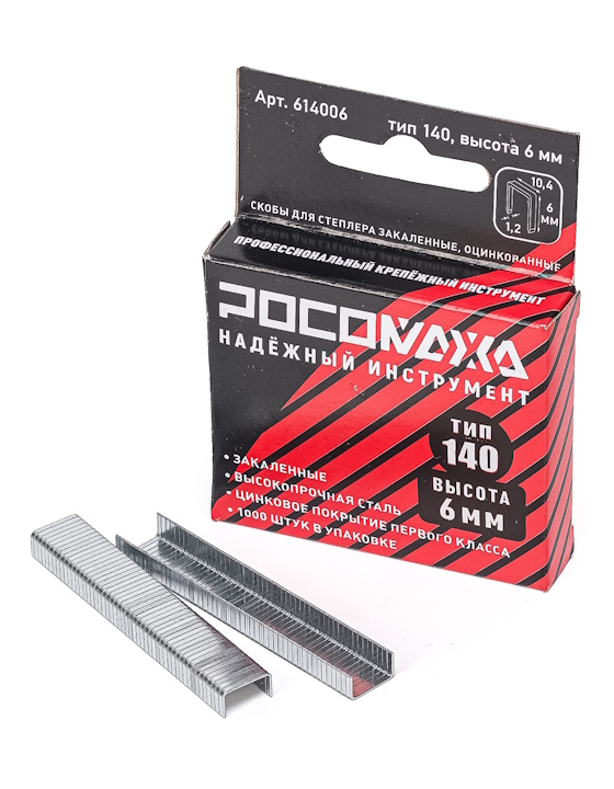 Скобы для степлера закаленные, оцинкованные (тип 140, 1000 шт./уп.), высота 6 мм "РОСОМАХА"