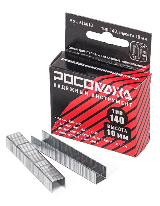 Скобы для степлера закаленные, оцинкованные (тип 140, 1000 шт./уп.), высота 10 мм "РОСОМАХА"