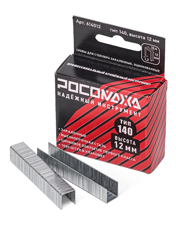 Скобы для степлера закаленные, оцинкованные (тип 140, 1000 шт./уп.), высота 12 мм "РОСОМАХА"