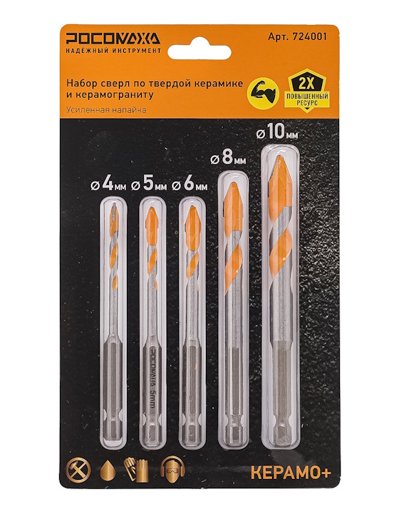 Набор сверл по твердой керамике и керамограниту (4, 5, 6, 8, 10 мм) "РОСОМАХА"
