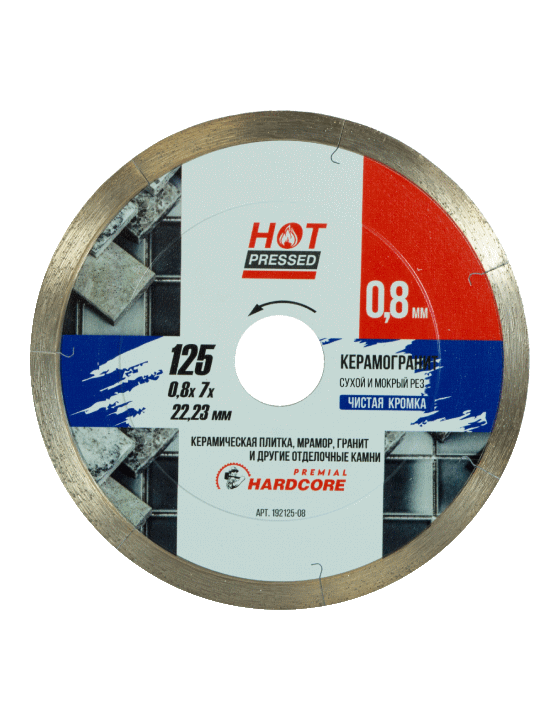 Диск отр.алмазный Ультратонкий 125х0,8х7х22,23мм Hardcore Керамогранит, сухой/мокрый рез; толщина кромки 0,8мм