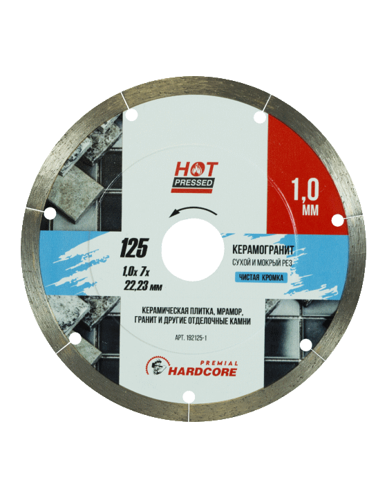 Диск отр.алмазный Ультратонкий 125х1,0х7х22,23мм Hardcore Керамогранит, сухой/мокрый рез; толщина кромки 1,0мм