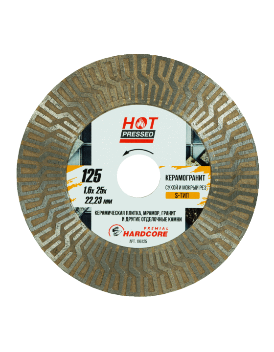 Диск отр.алмазный 125х1,6х25х22,23мм Hardcore Керамогранит заусовочный, сухой/мокрый рез и шлифование, сегмент 25мм S-тип