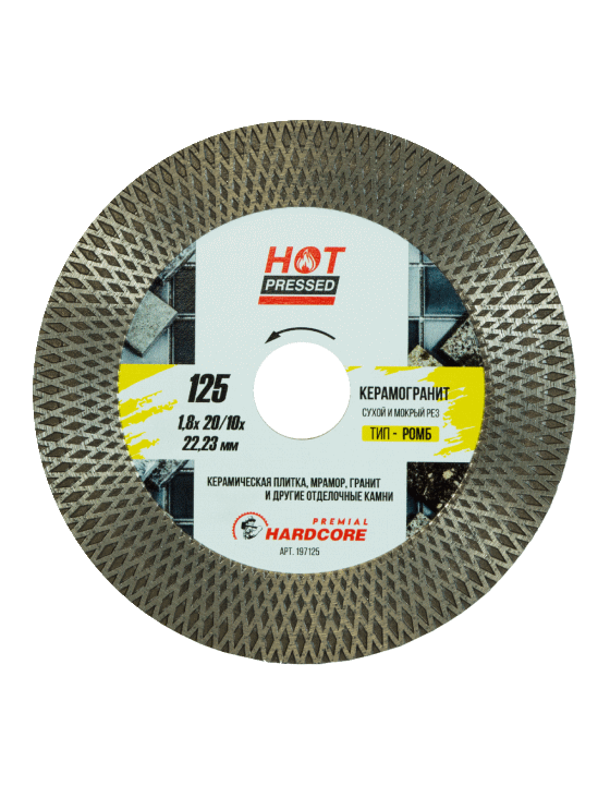Диск отр.алмазный 125х1,8х20/10х22,23мм Hardcore Керамогранит заусовочный, сухой/мокрый рез и шлифование, сегмент 20/10мм тип Ромб